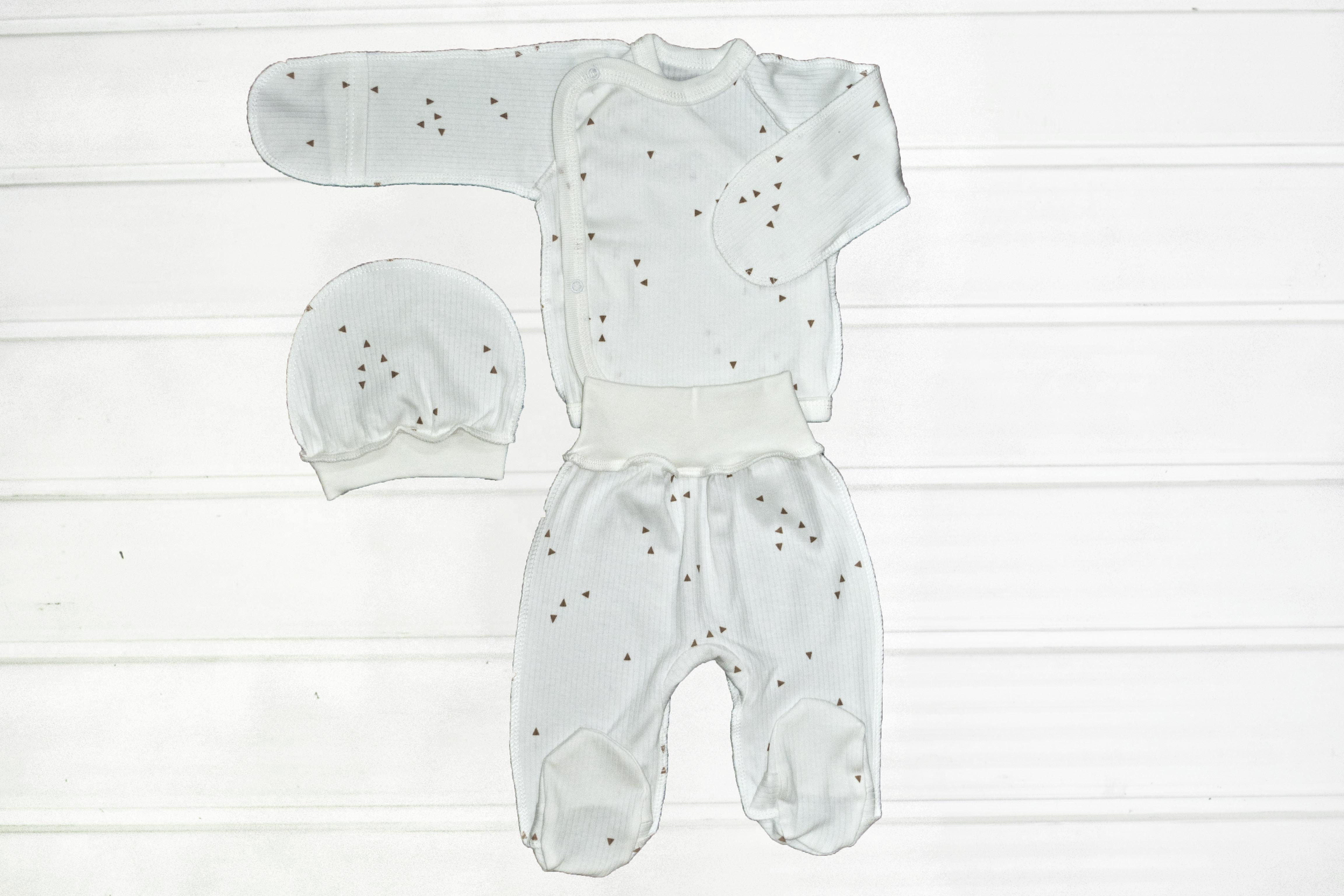 Комплект ясельний 3-х предметний пошит з якісного полотна інтерлок (раппорт) і складається з кофточки-распашонки на кнопці, повзунка (єврика) і шапочки. Це відмінний вибір для Вашого малюка.