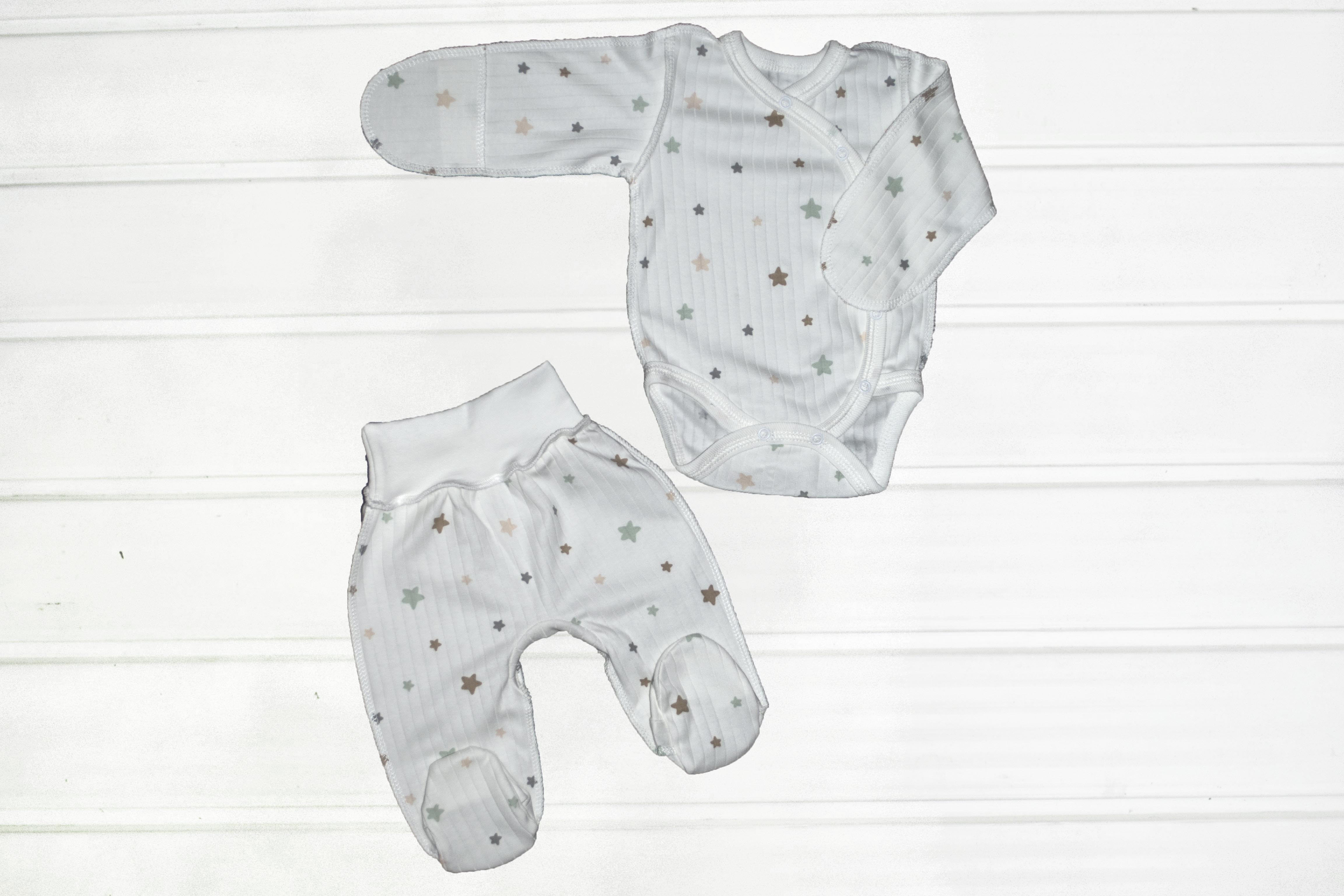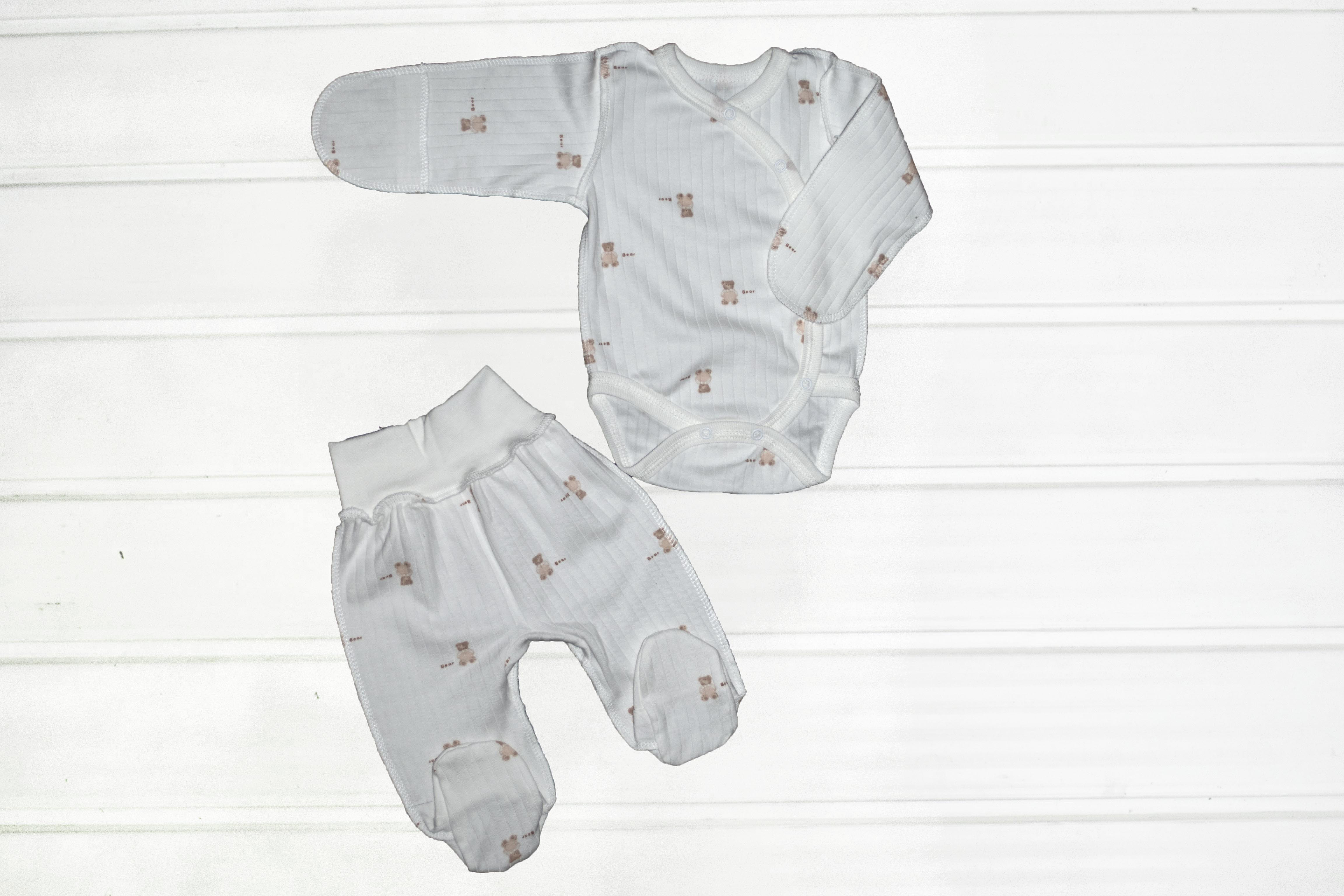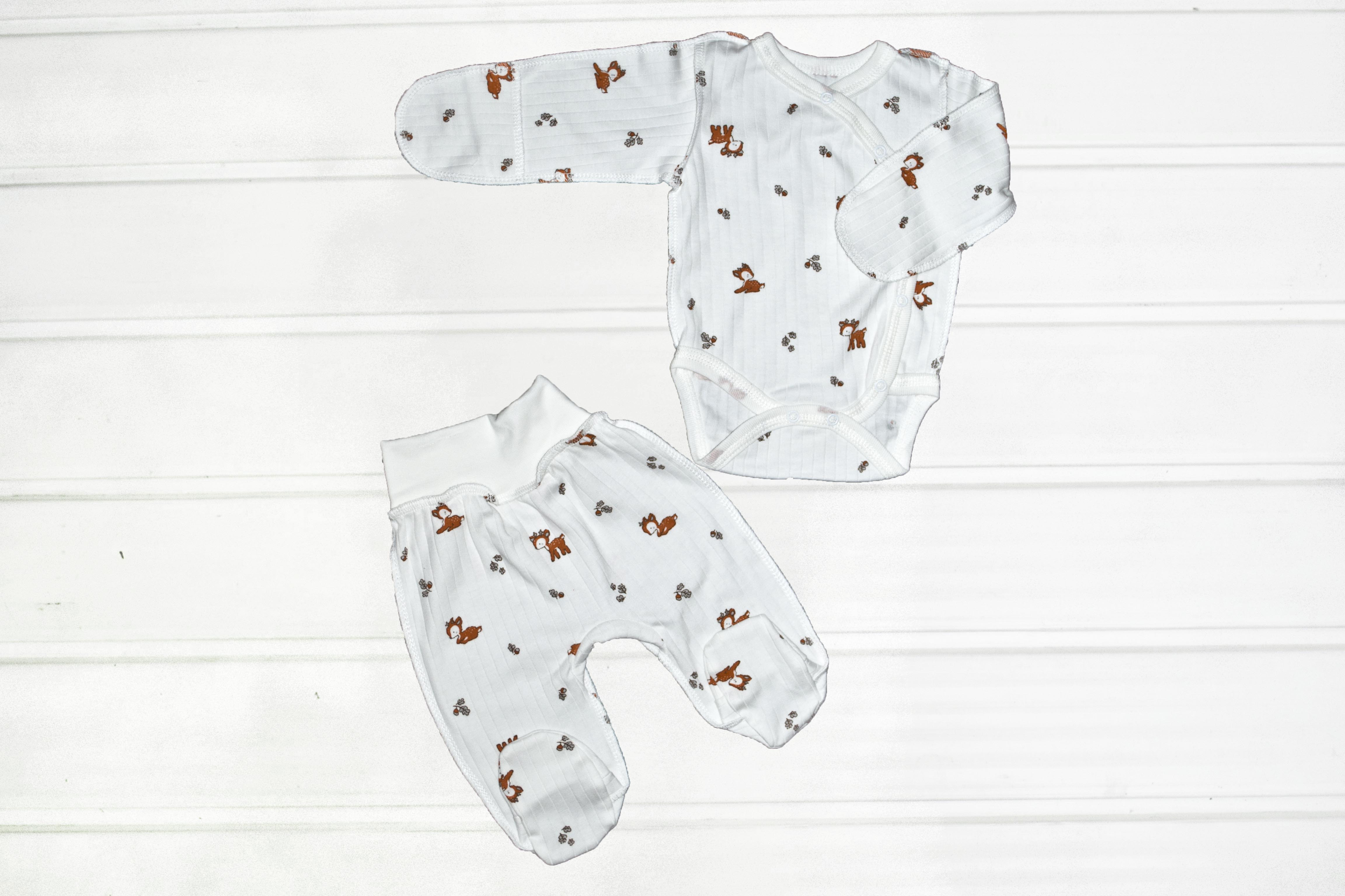 Красивий зручний ясельний комплект пошитий із якісного бавовняного полотна раппорт інтерлок. Складається з боді-кофточка і повзунків. Застібається на кнопки.