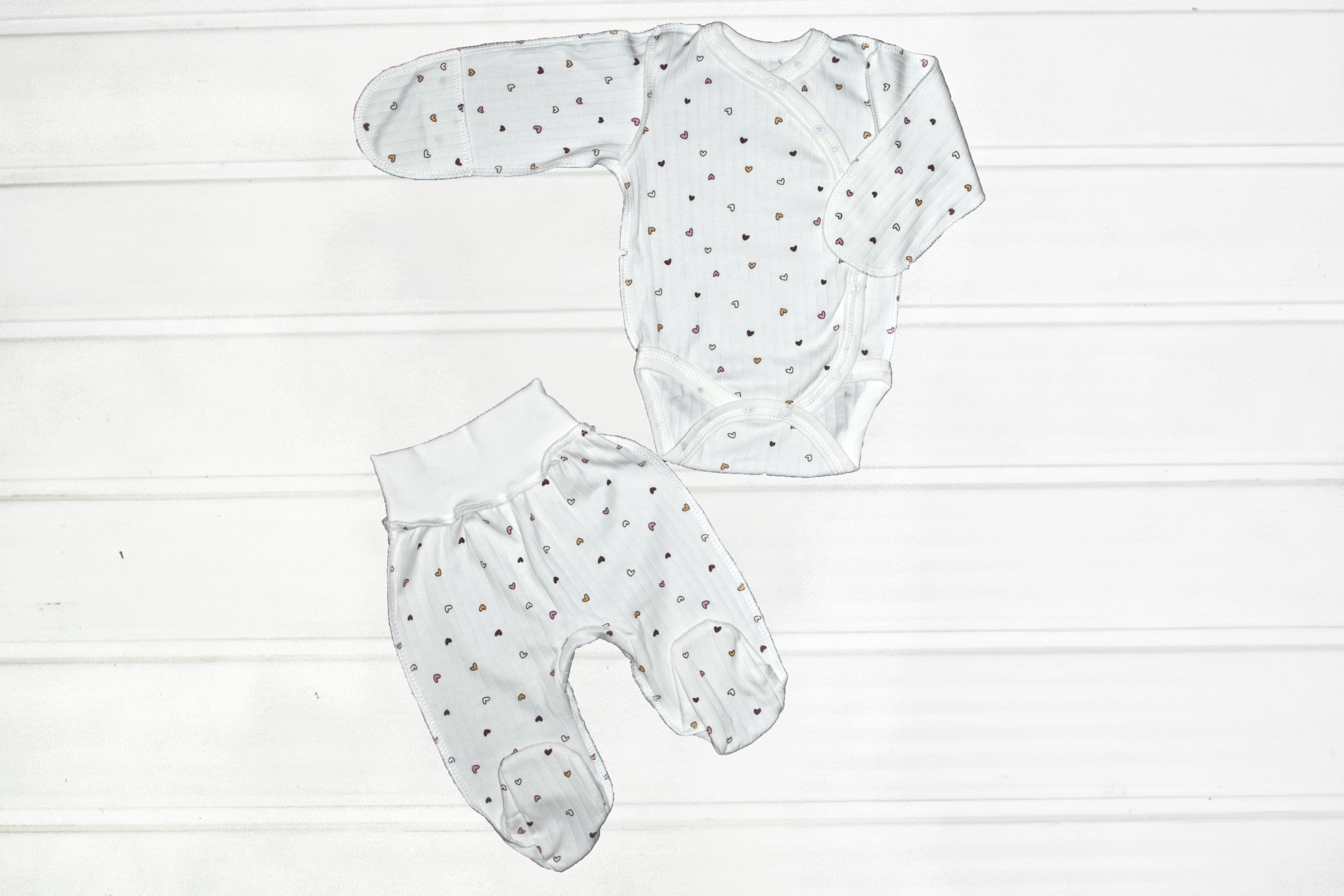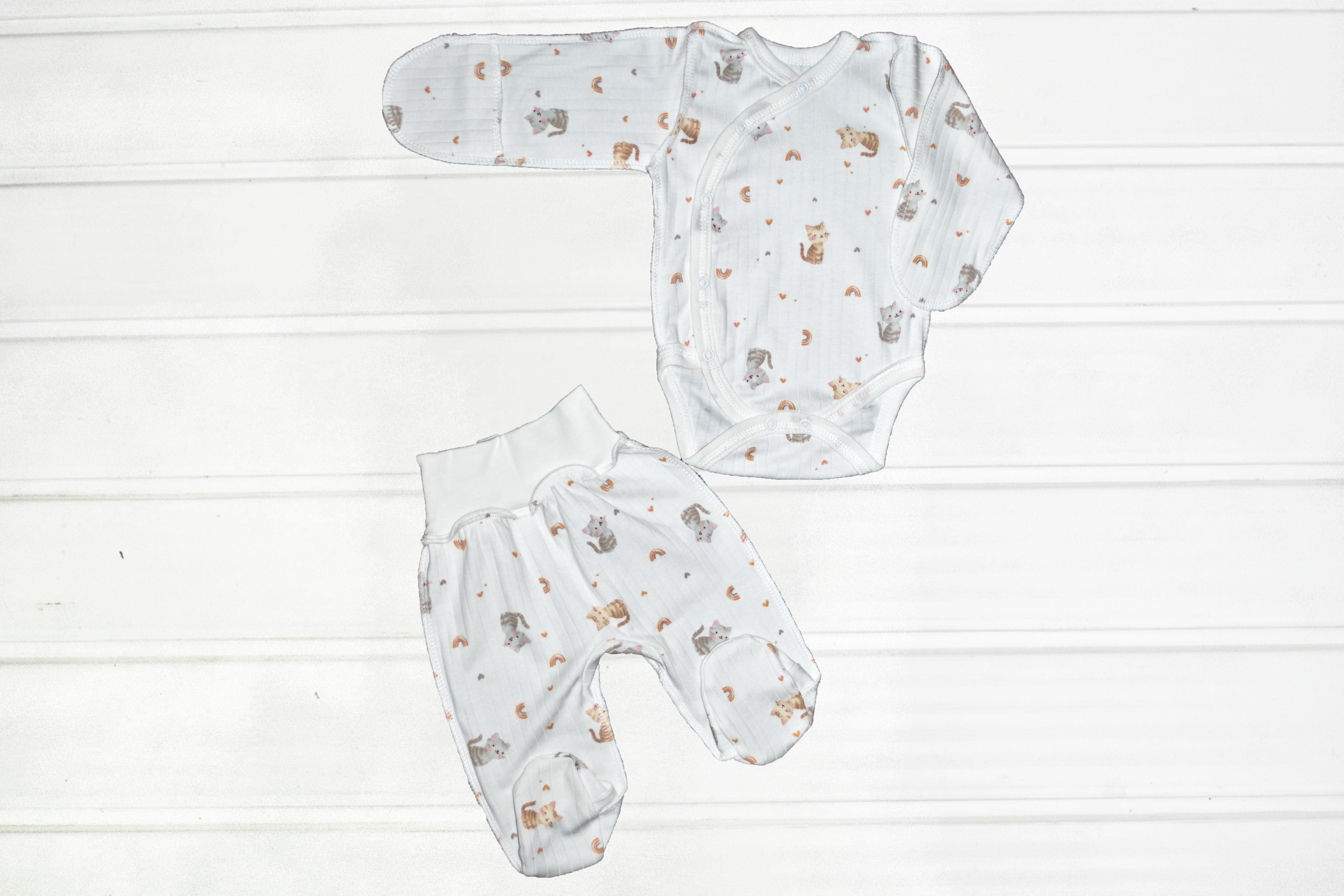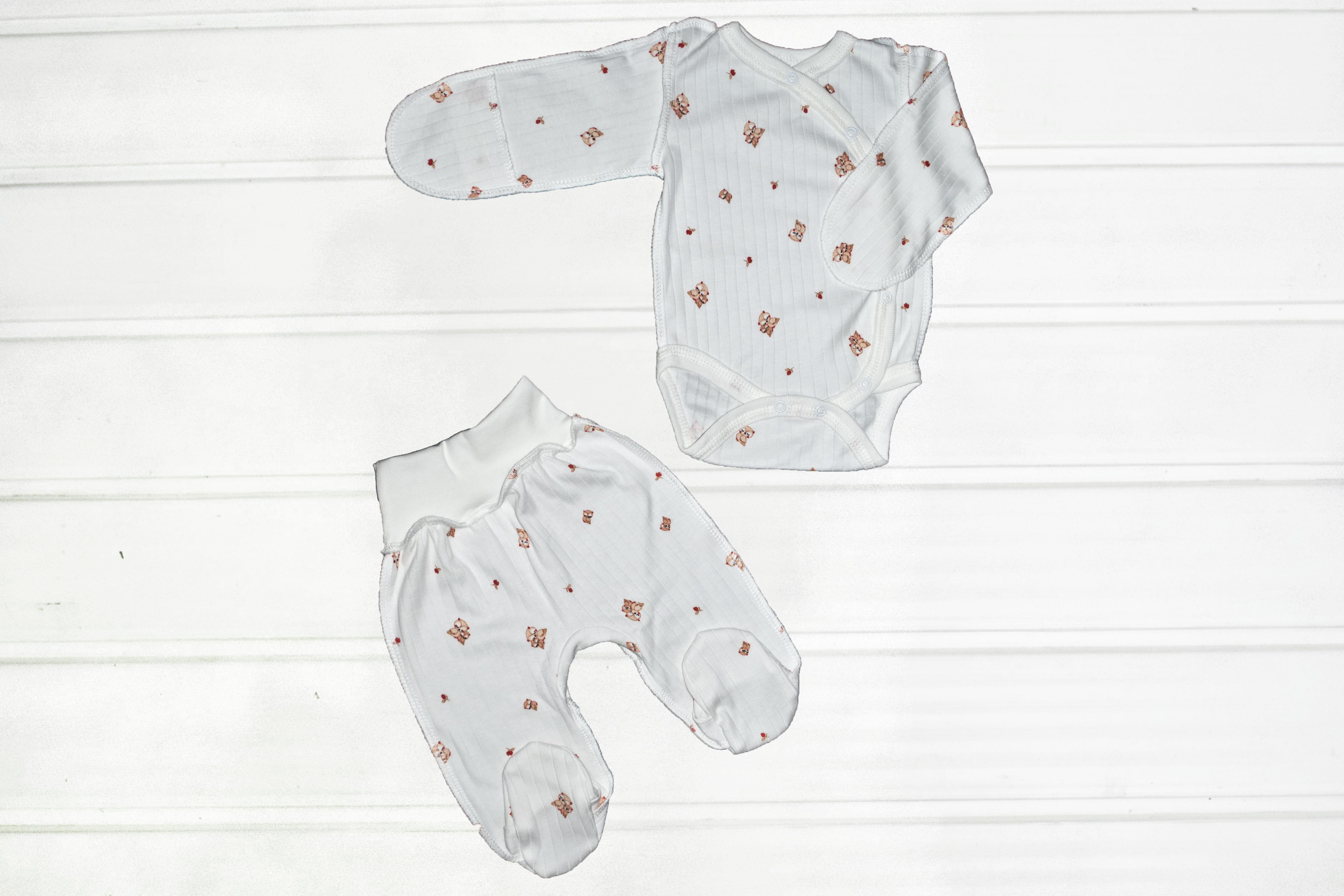 Красивий зручний ясельний комплект пошитий із якісного бавовняного полотна раппорт інтерлок. Складається з боді-кофточка і повзунків. Застібається на кнопки.