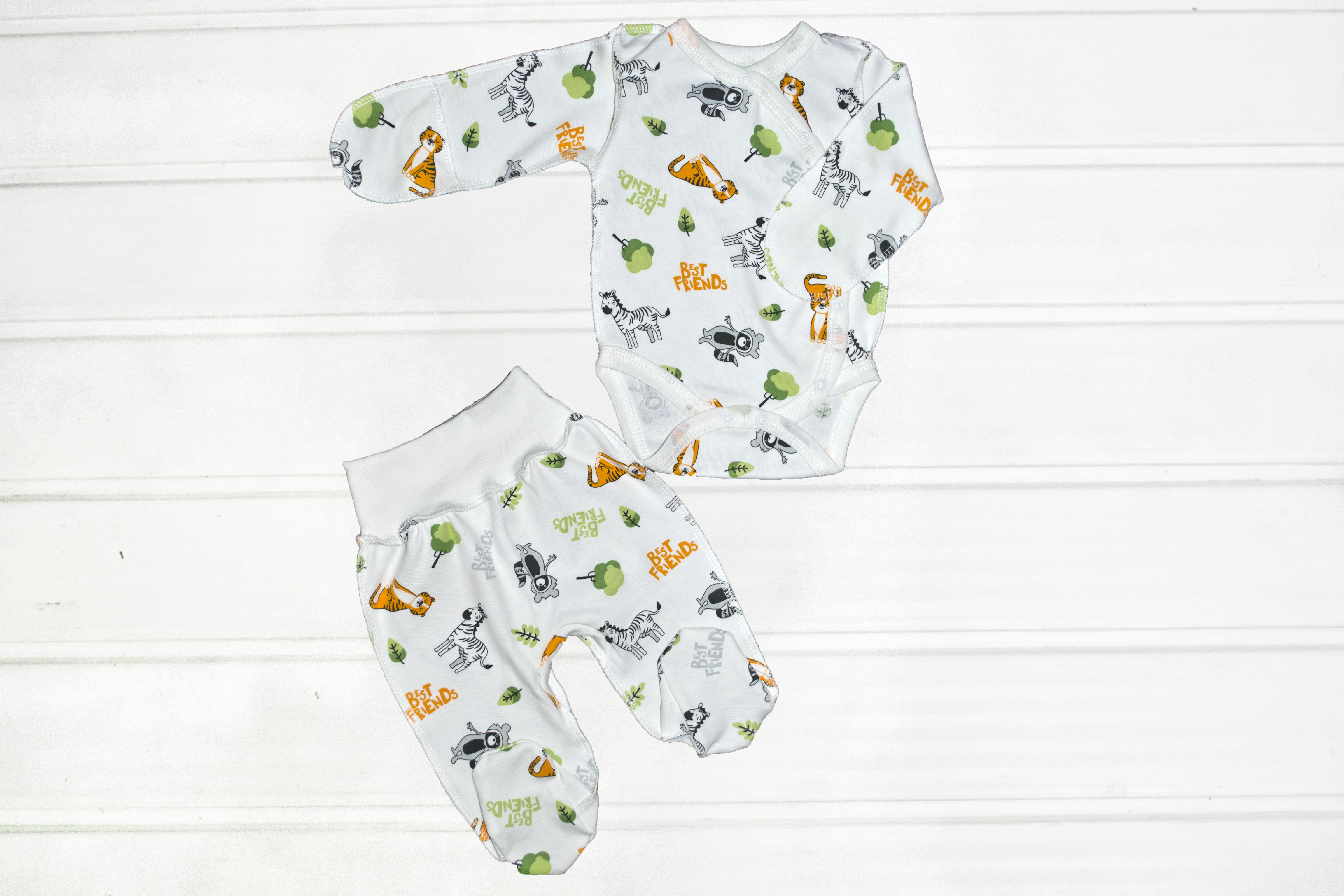 Красивий зручний ясельний комплект пошитий із якісного бавовняного набивного полотна інтерлок. Складається з боді-кофточка і повзунків. Застібається на кнопки.